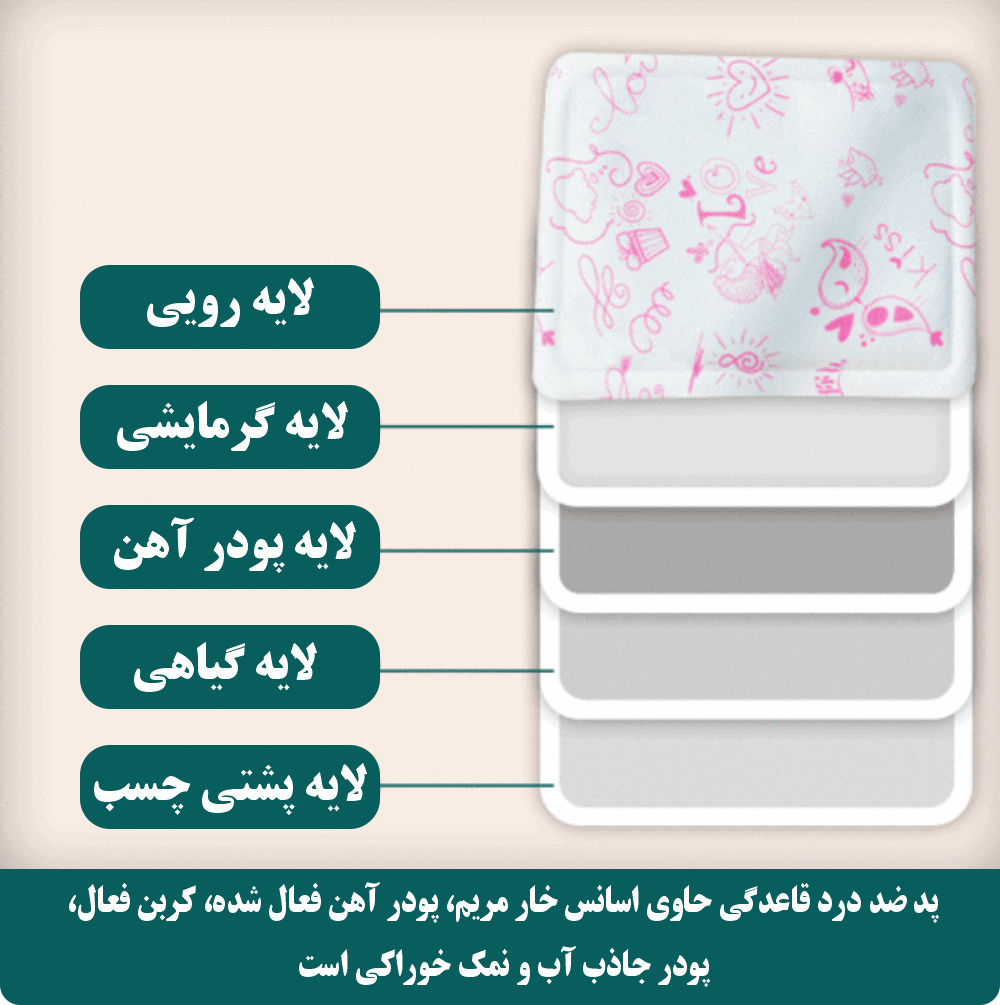 پد درد قاعدگی حاوی اسانس خار مریم، پودر آهن احیا شده، کربن فعال چوب، پودر ورمیکولیت منبسط شده، رزین جاذب آب و نمک خوراکی میباشد. این محصول یک لایه کاغذ روی چسب خود دارد که بعد از باز کردن هر یک از این بسته ها، اول باید کاغذ را از روی چسب جدا کرده و روی لباس بچسبانید.
